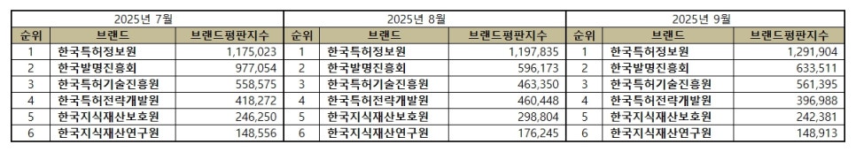 특허청 공공기관 브랜드평판 2025년 9월 빅데이터 분석결과, 1위 한국특허정보원 2위 한국발명진흥회 3위 한국특허기술진흥원 순으로 분석되었다.