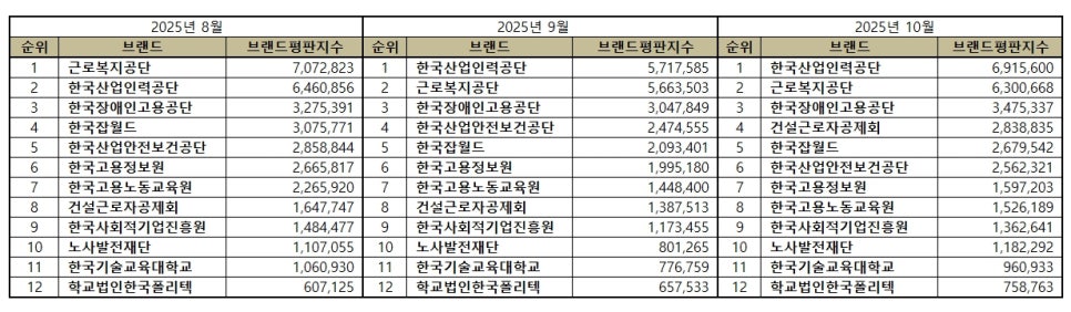 고용노동부 공공기관 브랜드평판 2025년 10월 빅데이터 분석결과, 1위 한국산업인력공단 2위 근로복지공단 3위 한국장애인고용공단 순으로 분석되었다.