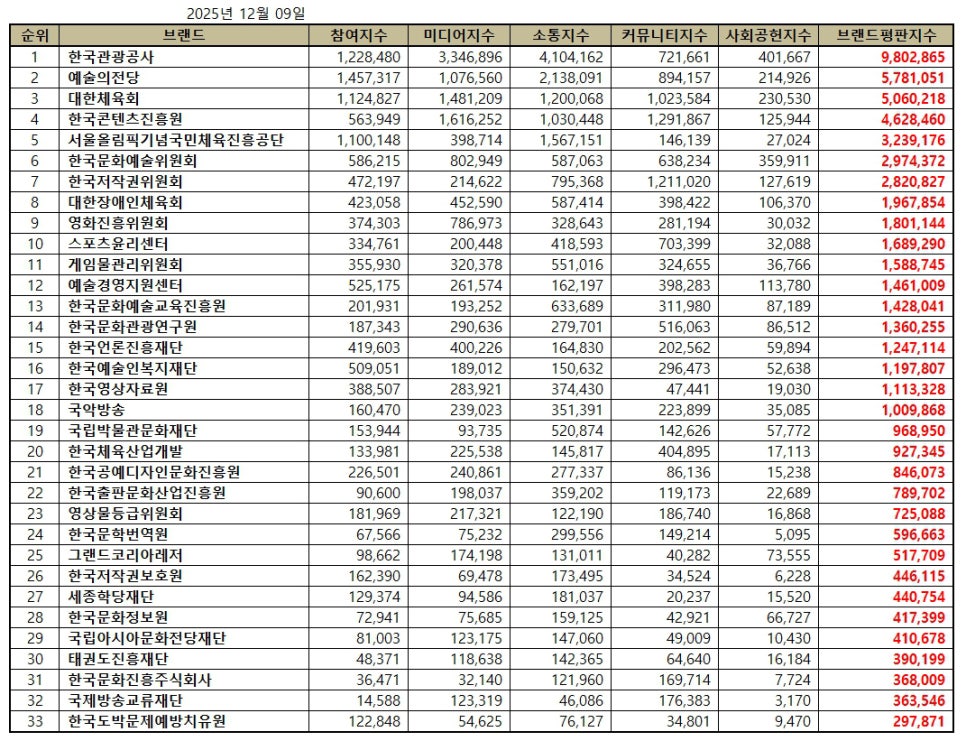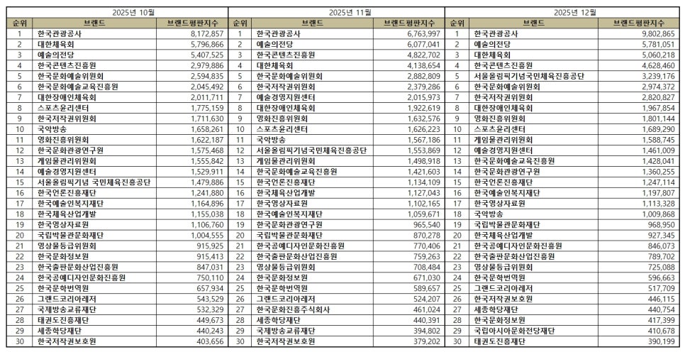문화체육관광부 공공기관 브랜드평판 2025년 12월 빅데이터 분석결과, 1위 한국관광공사 2위 예술의전당 3위 대한체육회 순으로 분석되었다.
