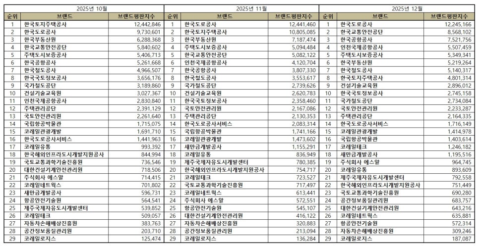 [브랜드평판] 국토교통부 공공기관 브랜드 2025년 12월 빅데이터 분석결과...1위 한국도로공사, 2위 한국교통안전공단, 3…