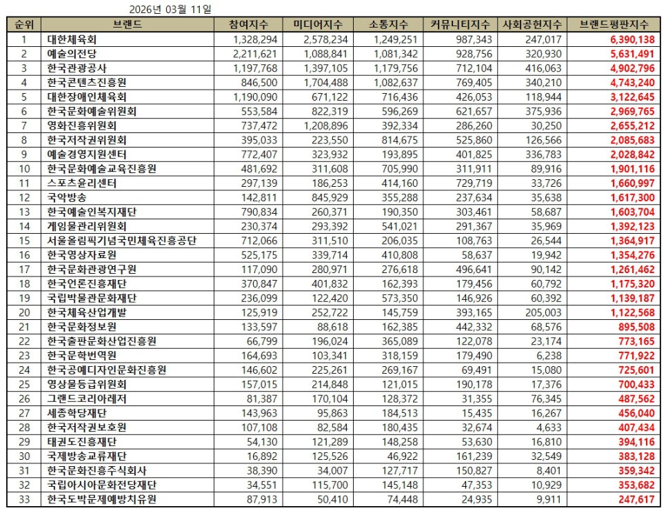 2026년 3월 문화체육관광부 공공기관 브랜드평판 순위는 대한체육회, 예술의전당, 한국관광공사, 한국콘텐츠진흥원, 대한장애인체육회, 한국문화예술위원회, 영화진흥위원회, 한국저작권위원회, 예술경영지원센터, 한국문화예술교육진흥원, 스포츠윤리센터, 국악방송, 한국예술인복지재단, 게임물관리위원회, 서울올림픽기념국민체육진흥공단, 한국영상자료원, 한국문화관광연구원, 한국언론진흥재단, 국립박물관문화재단, 한국체육산업개발, 한국문화정보원, 한국출판문화산업진흥원, 한국문학번역원, 한국공예디자인문화진흥원, 영상물등급위원회, 그랜드코리아레저, 세종학당재단, 한국저작권보호원, 태권도진흥재단, 국제방송교류재단, 한국문화진흥주식회사, 국립아시아문화전당재단, 한국도박문제예방치유원 순이었다.