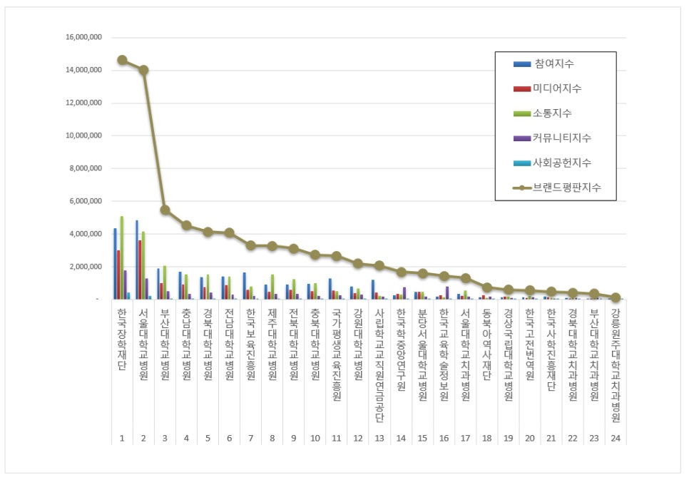 2위, 서울대학교병원 브랜드는 참여지수 4,837,140 미디어지수 3,598,733 소통지수 4,131,624 커뮤니티지수 1,267,976 사회공헌지수 210,455가 되면서 브랜드평판지수 14,045,927로 분석됐다. 지난 2월 브랜드평판지수 7,068,254와 비교해보면 98.72% 상승했다.