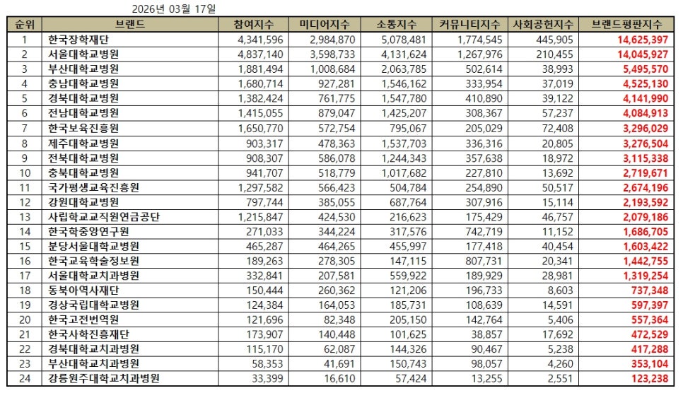 [브랜드평판] 교육부 공공기관 브랜드 2026년 3월 빅데이터 분석결과...1위 한국장학재단, 2위 서울대학교병원, 3위 부산…