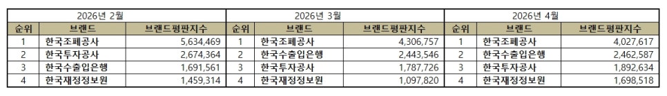 [브랜드평판] 재정경제부 공공기관 브랜드 2026년 4월 빅데이터 분석결과...1위 한국조폐공사, 2위 한국수출입은행, 3위 …