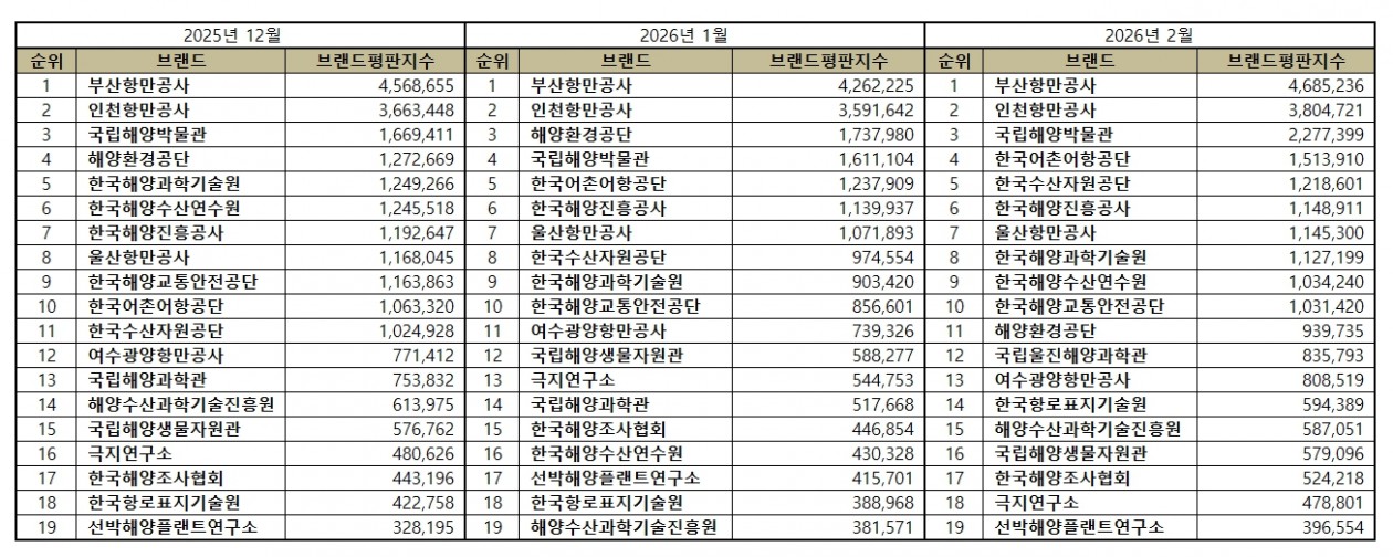 2026년 2월 해양수산부 공공기관 브랜드평판 순위는 부산항만공사, 인천항만공사, 국립해양박물관, 한국어촌어항공단, 한국수산자원공단, 한국해양진흥공사, 울산항만공사, 한국해양과학기술원, 한국해양수산연수원, 한국해양교통안전공단, 해양환경공단, 국립울진해양과학관 , 여수광양항만공사, 한국항로표지기술원, 해양수산과학기술진흥원, 국립해양생물자원관, 한국해양조사협회, 극지연구소, 선박해양플랜트연구소 순이었다.