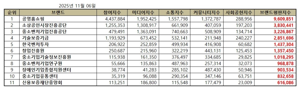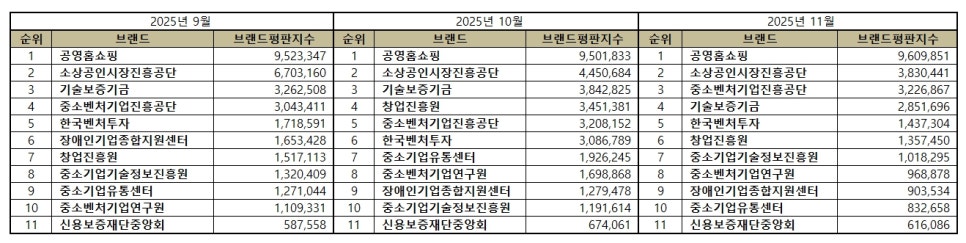[브랜드평판] 중소벤처기업부 공공기관 브랜드 2025년 11월 빅데이터 분석결과...1위 공영홈쇼핑, 2위 소상공인시장진흥공단…