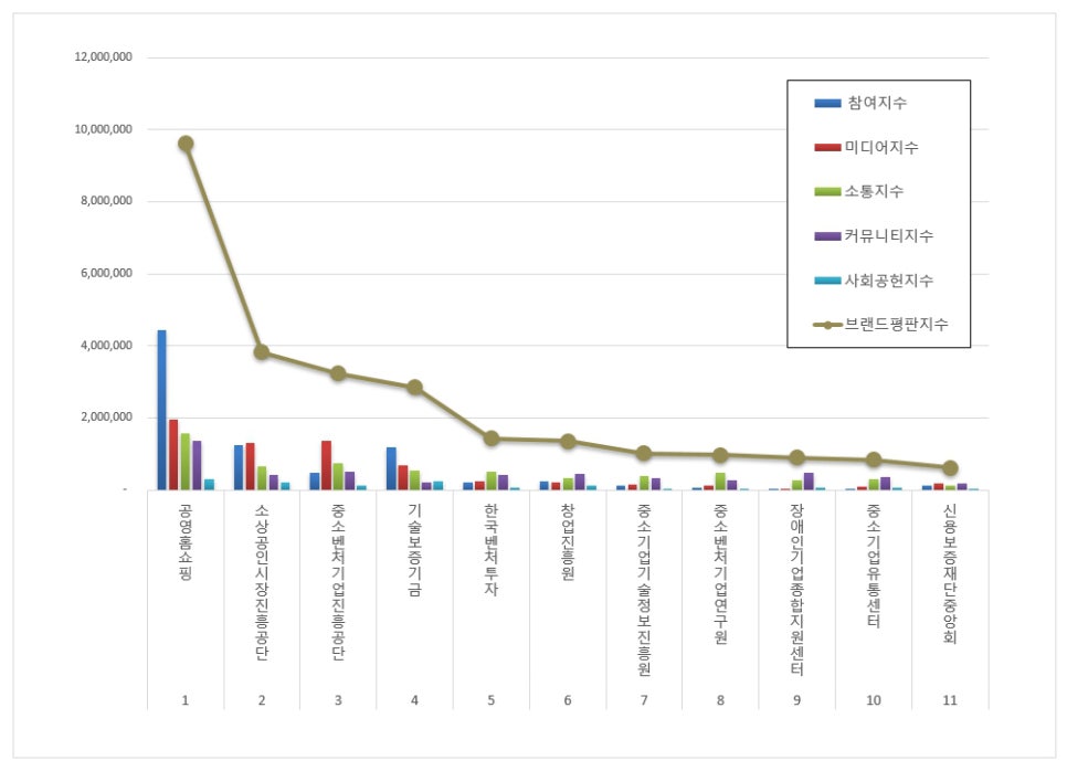 2025년 11월 중소벤처기업부 공공기관 브랜드평판 순위는 공영홈쇼핑, 소상공인시장진흥공단, 중소벤처기업진흥공단, 기술보증기금, 한국벤처투자, 창업진흥원, 중소기업기술정보진흥원, 중소벤처기업연구원, 장애인기업종합지원센터, 중소기업유통센터, 신용보증재단중앙회 순이었다.