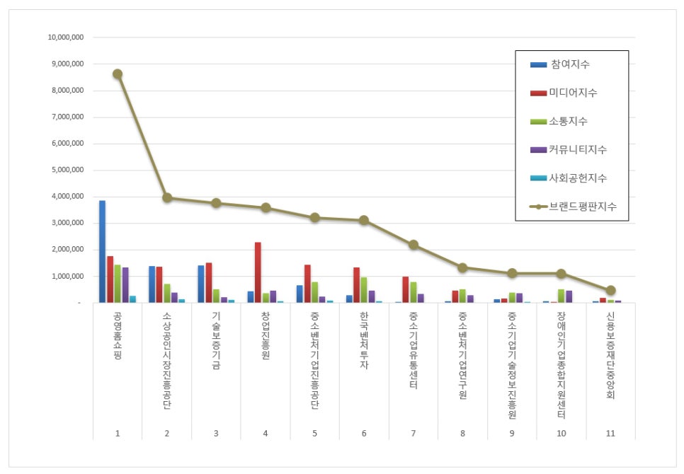 5위, 중소벤처기업진흥공단 브랜드는 참여지수 655,317 미디어지수 1,446,329 소통지수 791,719 커뮤니티지수 235,105 사회공헌지수 84,996이 되면서 브랜드평판지수 3,213,467로 분석됐다. 지난 3월 브랜드평판지수 2,473,090과 비교해보면 29.94% 상승했다.