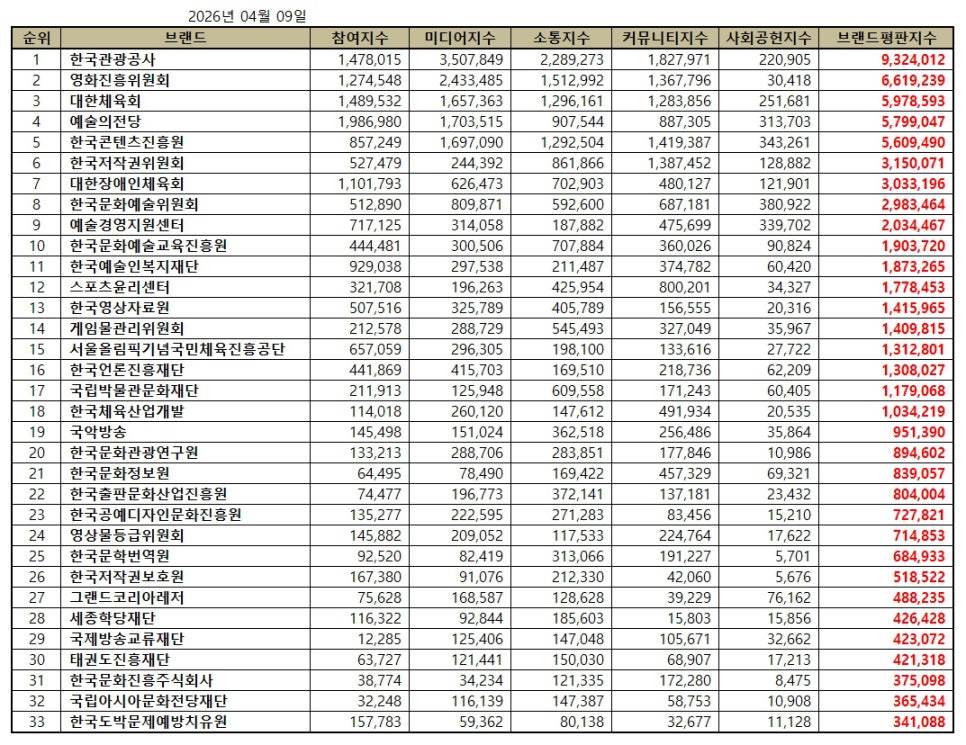 한국기업평판연구소 ( 소장 구창환 ) 는 국내 브랜드의 평판지수를 매달 측정하여 브랜드 평판지수의 변화량을 발표하고 있다. 2026년 4월 문화체육관광부 공공기관 브랜드평판지수는 2026년 3월 9일부터 2026년 4월 9일까지의 33개 문화체육관광부 공공기관 브랜드에 대한 빅데이터 분석 결과이다.