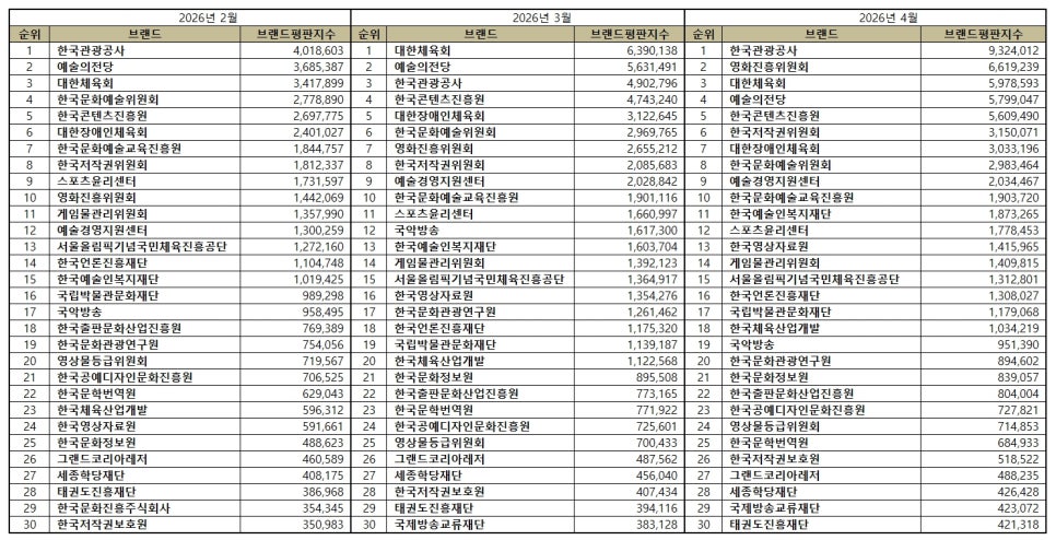 문화체육관광부 공공기관 브랜드평판 2026년 4월 빅데이터 분석결과, 1위 한국관광공사 2위 영화진흥위원회 3위 대한체육회 순으로 분석되었다.