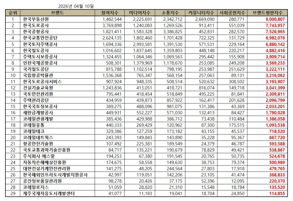 [브랜드평판] 국토교통부 공공기관 브랜드 2026년 4월 빅데이터 분석결과...1위 한국부동산원, 2위 한국도로공사, 3위 한…