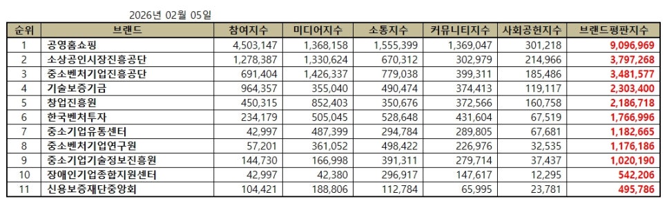 [브랜드평판] 중소벤처기업부 공공기관 브랜드 2026년 2월 빅데이터 분석결과...1위 공영홈쇼핑, 2위 소상공인시장진흥공단,…
