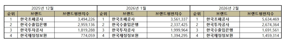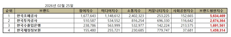 한국기업평판연구소 ( 소장 구창환 ) 는 국내 브랜드의 평판지수를 매달 측정하여 브랜드 평판지수의 변화량을 발표하고 있다. 2026년 2월 재정경제부 공공기관 브랜드평판지수는 2026년 1월 25일부터 2026년 2월 25일까지의 4개 재정경제부 공공기관 브랜드에 대한 빅데이터 분석 결과이다.