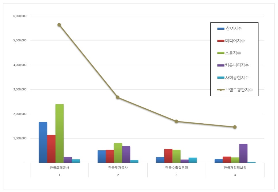 4위, 한국재정정보원 브랜드는 참여지수 155,480 미디어지수 255,721 소통지수 230,685 커뮤니티지수 779,747 사회공헌지수 37,681이 되면서 브랜드평판지수 1,459,314로 분석됐다. 지난 1월 브랜드평판지수 1,394,295와 비교해보면 4.66% 상승했다.