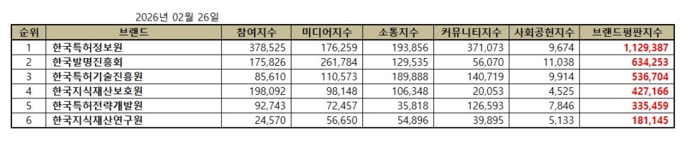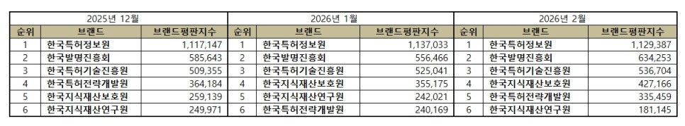 2026년 2월 특허청 공공기관 브랜드평판 순위는 한국특허정보원, 한국발명진흥회, 한국특허기술진흥원, 한국지식재산보호원, 한국특허전략개발원, 한국지식재산연구원 순이었다.