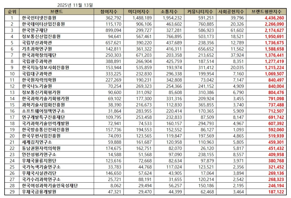 과학기술정보통신부 공공기관 브랜드평판 2025년 11월 빅데이터 분석결과, 1위 한국인터넷진흥원 2위 한국데이터산업진흥원 3위 한국연구재단 순으로 분석되었다.