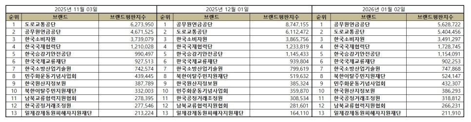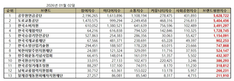 [브랜드평판] 행정안전 공공기관 브랜드 2026년 1월 빅데이터 분석결과...1위 공무원연금공단, 2위 도로교통공단, 3위 한…