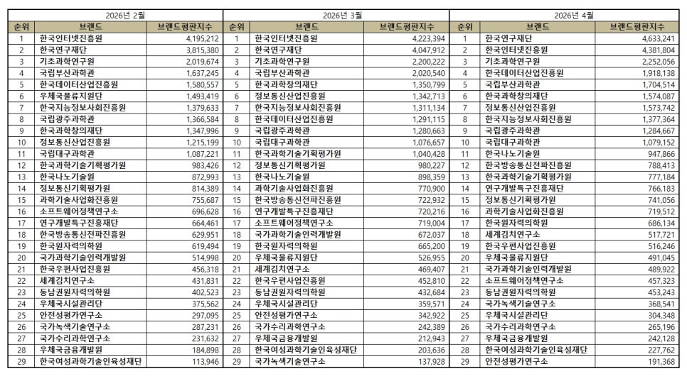 [브랜드평판] 과학기술정보통신부 공공기관 브랜드 2026년 4월 빅데이터 분석결과...1위 한국연구재단, 2위 한국인터넷진흥원…