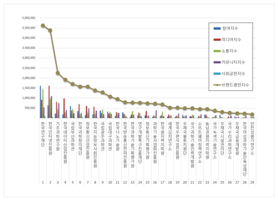 2026년 4월 과학기술정보통신부 공공기관 브랜드평판 순위는 한국연구재단, 한국인터넷진흥원, 기초과학연구원, 한국데이터산업진흥원, 국립부산과학관, 한국과학창의재단, 정보통신산업진흥원, 한국지능정보사회진흥원, 국립광주과학관, 국립대구과학관, 한국나노기술원, 한국방송통신전파진흥원, 한국과학기술기획평가원, 연구개발특구진흥재단, 정보통신기획평가원, 과학기술사업화진흥원, 한국원자력의학원, 세계김치연구소, 한국우편사업진흥원, 우체국물류지원단, 국가과학기술인력개발원, 소프트웨어정책연구소, 동남권원자력의학원, 국가녹색기술연구소, 우체국시설관리단, 국가수리과학연구소, 우체국금융개발원, 한국여성과학기술인육성재단, 안전성평가연구소 순이었다.