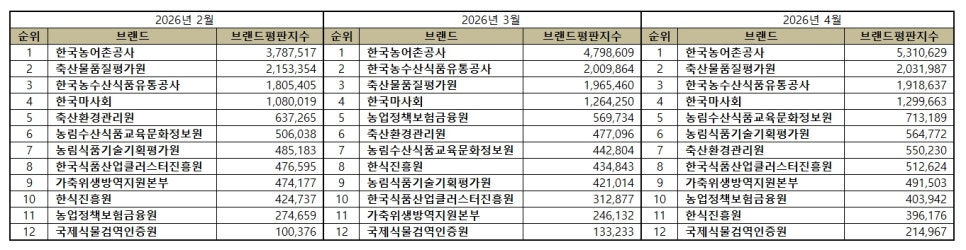 농림축산식품부 공공기관 브랜드평판 2026년 4월 빅데이터 분석결과, 1위 한국농어촌공사 2위 축산물품질평가원 3위 한국농수산식품유통공사 순으로 분석되었다.