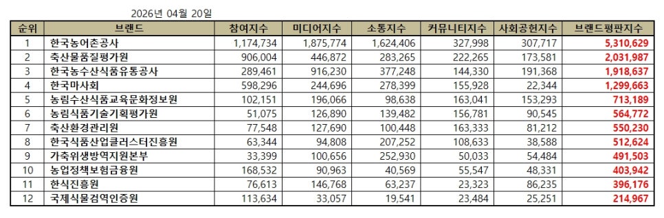 [브랜드평판] 농림축산식품부 공공기관 브랜드 2026년 4월 빅데이터 분석결과...1위 한국농어촌공사, 2위 축산물품질평가원,…