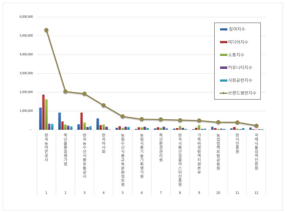 5위, 농림수산식품교육문화정보원 브랜드는 참여지수 102,151 미디어지수 196,066 소통지수 98,638 커뮤니티지수 163,041 사회공헌지수 153,293이 되면서 브랜드평판지수 713,189로 분석됐다. 지난 3월 브랜드평판지수 442,804와 비교해보면 61.06% 상승했다.