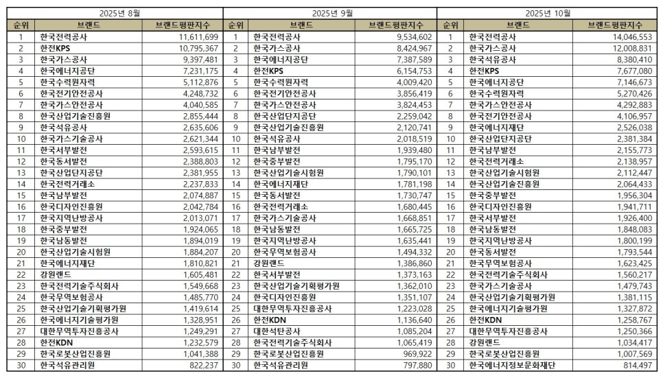 산업통상자원부 공공기관 브랜드평판 2025년 10월 빅데이터 분석결과, 1위 한국전력공사 2위 한국가스공사 3위 한국석유공사 순으로 분석되었다.