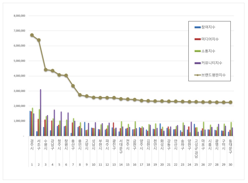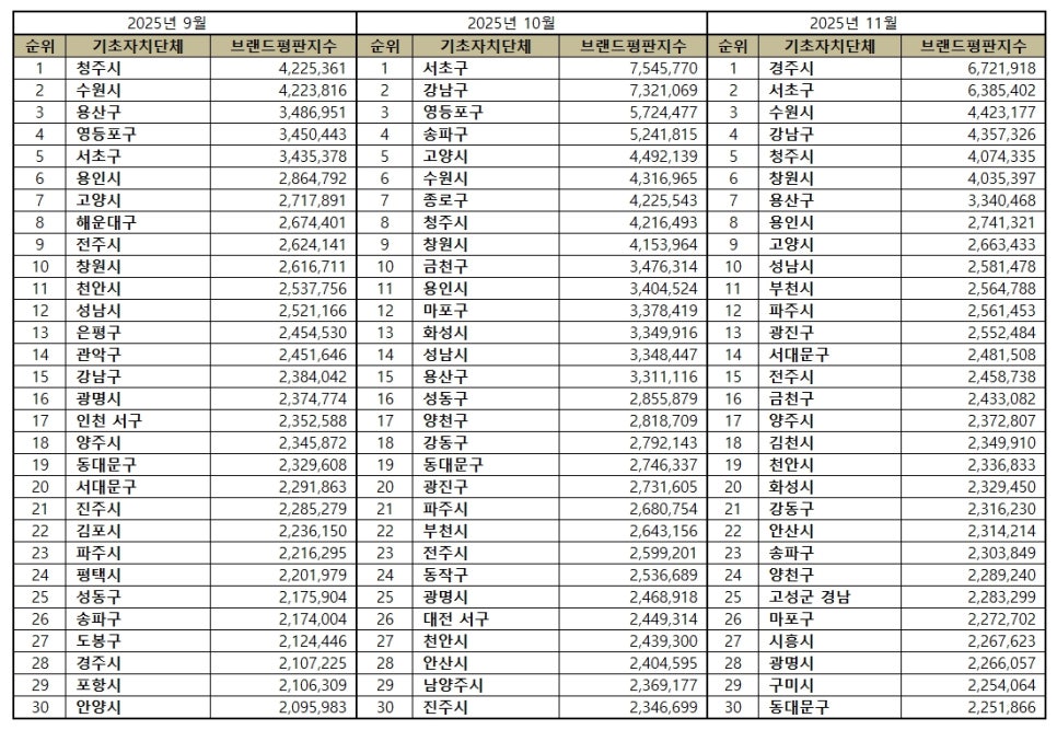 2025년 11월 대한민국 기초자치단체 브랜드평판 30위 순위는 경주시, 서초구, 수원시, 강남구, 청주시, 창원시, 용산구, 용인시, 고양시, 성남시, 부천시, 파주시, 광진구, 서대문구, 전주시, 금천구, 양주시, 김천시, 천안시, 화성시, 강동구, 안산시, 송파구, 양천구, 고성군 경남 , 마포구, 시흥시, 광명시, 구미시, 동대문구 순으로 분석되었다.