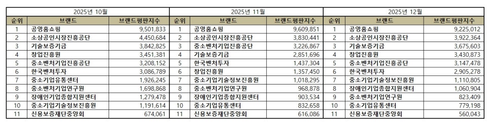 [브랜드평판] 중소벤처기업부 공공기관 브랜드 2025년 12월 빅데이터 분석결과...1위 공영홈쇼핑, 2위 소상공인시장진흥공단…