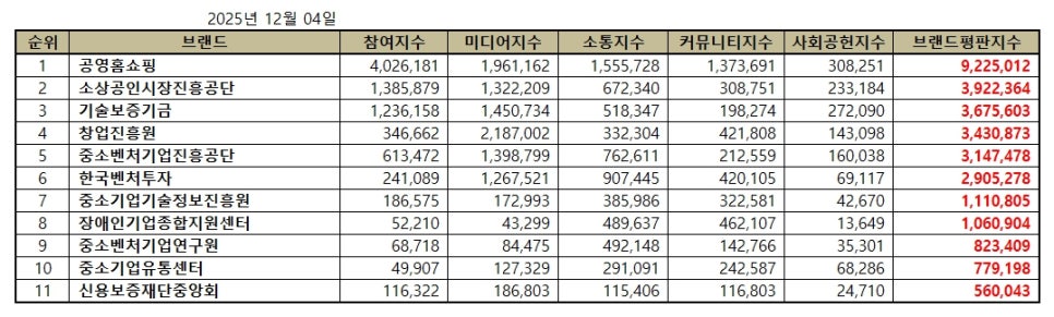 중소벤처기업부 공공기관 브랜드평판 2025년 12월 빅데이터 분석결과, 1위 공영홈쇼핑 2위 소상공인시장진흥공단 3위 기술보증기금 순으로 분석되었다.