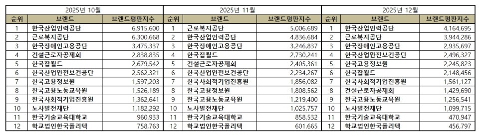 고용노동부 공공기관 브랜드평판 2025년 12월 빅데이터 분석결과, 1위 한국산업인력공단 2위 근로복지공단 3위 한국장애인고용공단 순으로 분석되었다.