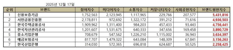 2025년 12월 금융위원회 공공기관 브랜드평판 순위는 신용보증기금, 서민금융진흥원, 한국주택금융공사, 한국자산관리공사, 중소기업은행, 예금보험공사, 한국산업은행 순이었다.