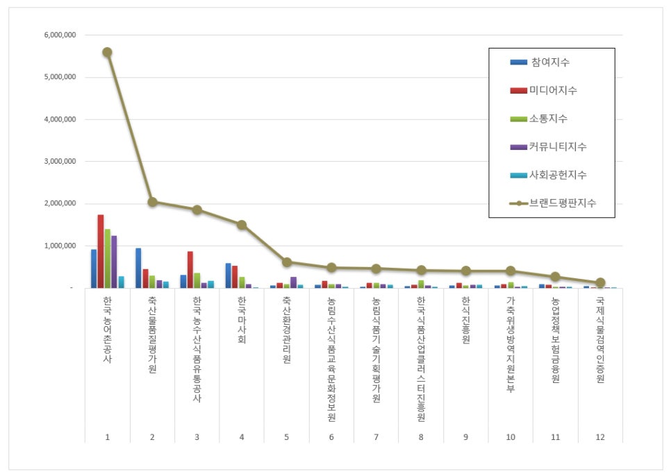 1위, 한국농어촌공사 브랜드는 참여지수 921,360 미디어지수 1,738,561 소통지수 1,408,212 커뮤니티지수 1,239,519 사회공헌지수 287,249가 되면서 브랜드평판지수 5,594,901로 분석됐다. 지난 11월 브랜드평판지수 5,150,921과 비교해보면 8.62% 상승했다.