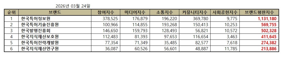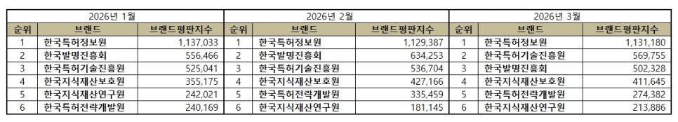 2026년 3월 특허청 공공기관 브랜드평판 순위는 한국특허정보원, 한국특허기술진흥원, 한국발명진흥회, 한국지식재산보호원, 한국특허전략개발원, 한국지식재산연구원 순이었다.