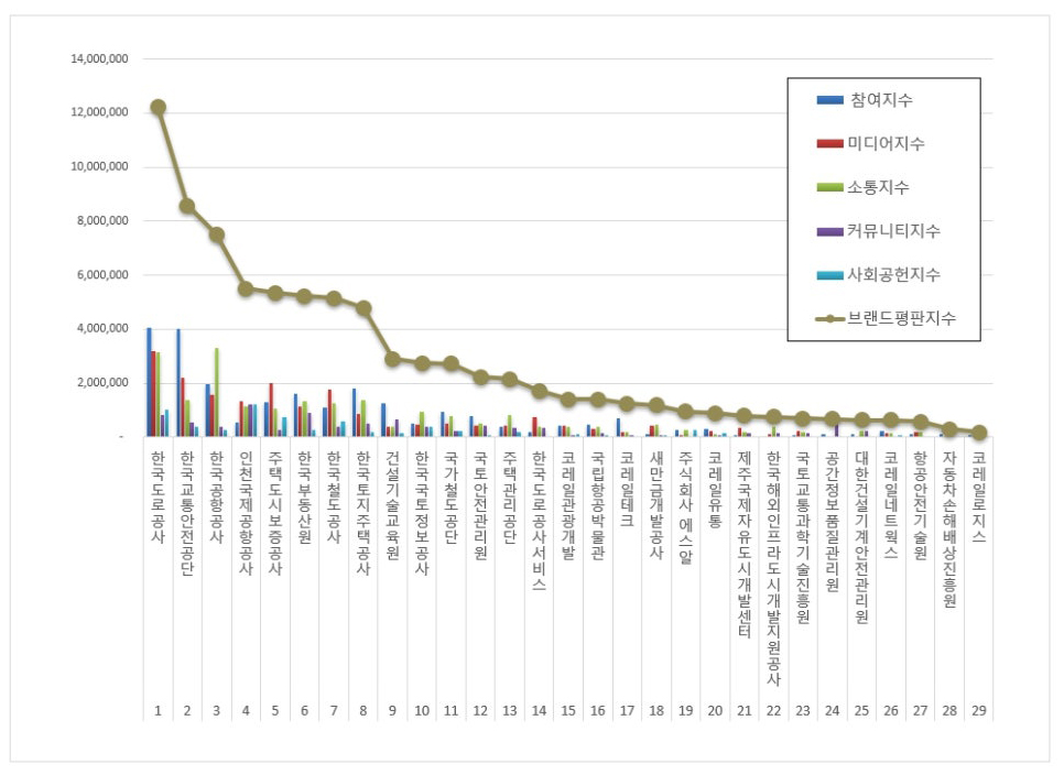 1위, 한국도로공사 브랜드는 참여지수 4,065,501 미디어지수 3,176,291 소통지수 3,166,963 커뮤니티지수 828,665 사회공헌지수 1,007,745가 되면서 브랜드평판지수 12,245,166으로 분석됐다. 지난 11월 브랜드평판지수 12,441,460과 비교해보면 1.58% 하락했다.