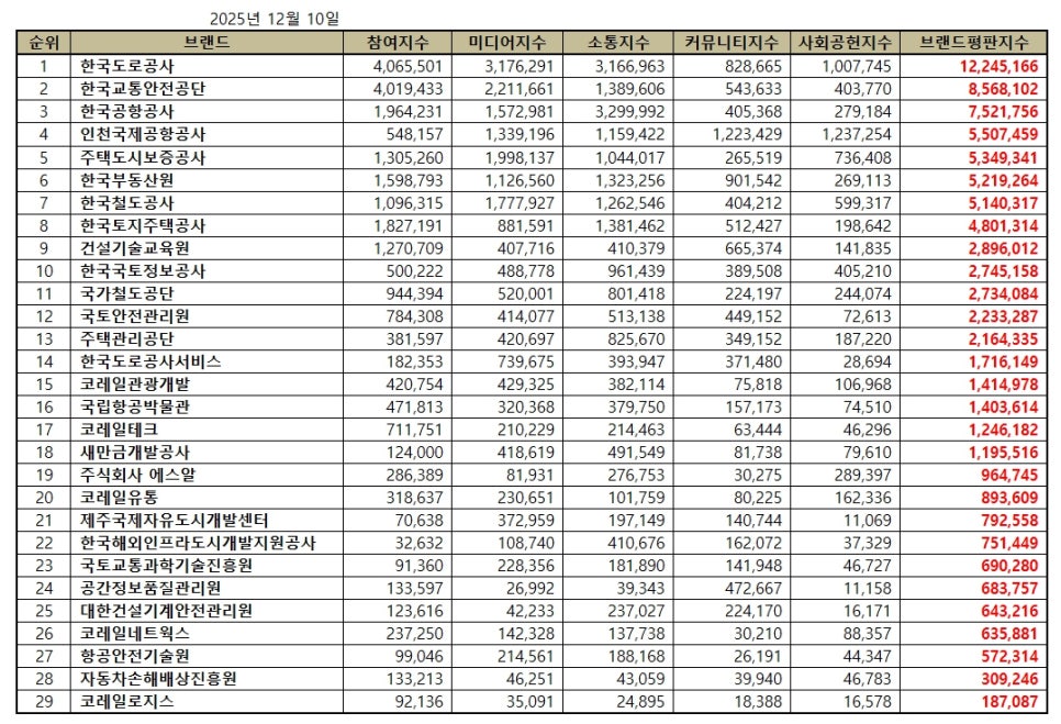 국토교통부 공공기관 브랜드평판 2025년 12월 빅데이터 분석결과, 1위 한국도로공사 2위 한국교통안전공단 3위 한국공항공사 순으로 분석되었다.