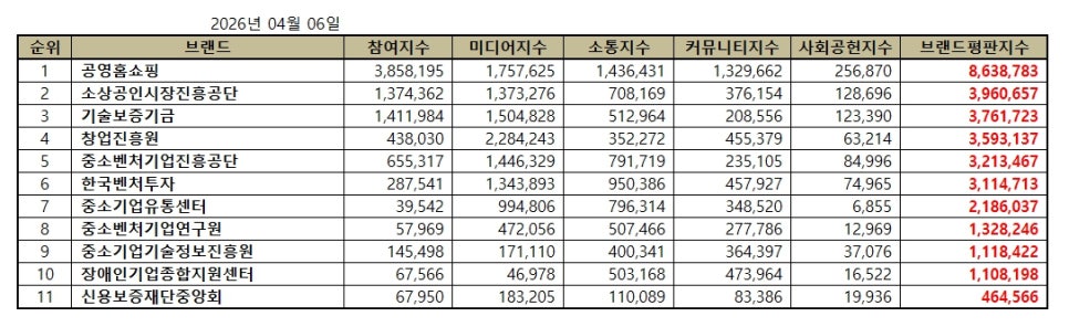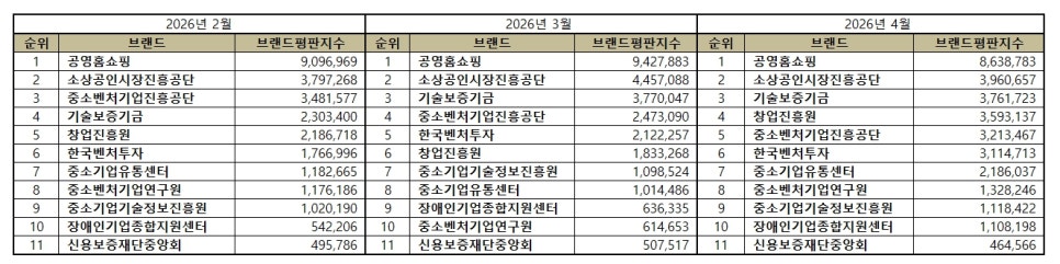 [브랜드평판] 중소벤처기업부 공공기관 브랜드 2026년 4월 빅데이터 분석결과...1위 공영홈쇼핑, 2위 소상공인시장진흥공단,…