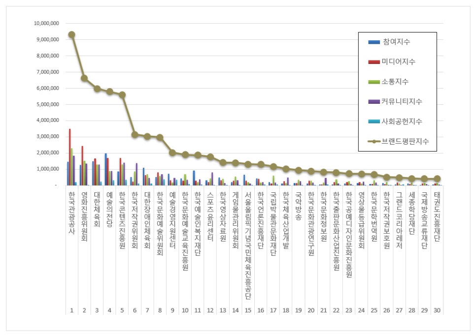 문화체육관광부 공공기관 브랜드평판 분석은 참여지수, 미디어지수, 소통지수, 커뮤니티지수, 사회공헌지수로 구분하여 브랜드평판지수를 산출하였다.