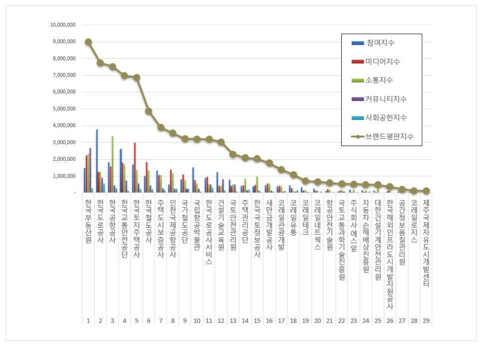국토교통부 공공기관 브랜드평판 분석은 참여지수, 미디어지수, 소통지수, 커뮤니티지수, 사회공헌지수로 구분하여 브랜드평판지수를 산출하였다.