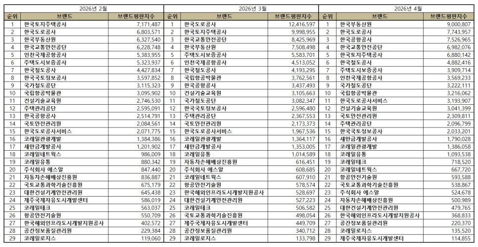 [브랜드평판] 국토교통부 공공기관 브랜드 2026년 4월 빅데이터 분석결과...1위 한국부동산원, 2위 한국도로공사, 3위 한…