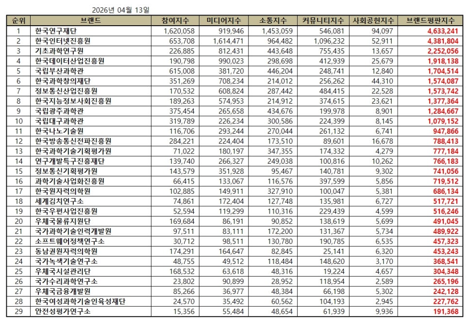 한국기업평판연구소 ( 소장 구창환 ) 는 국내 브랜드의 평판지수를 매달 측정하여 브랜드 평판지수의 변화량을 발표하고 있다. 2026년 4월 과학기술정보통신부 공공기관 브랜드평판지수는 2026년 3월 13일부터 2026년 4월 13일까지의 29개 과학기술정보통신부 공공기관 브랜드에 대한 빅데이터 분석 결과이다.
