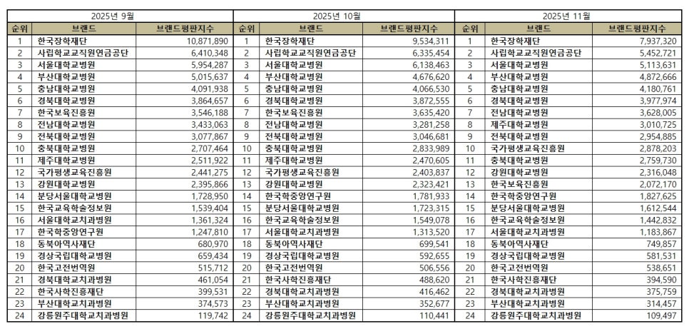 교육부 공공기관 브랜드평판 2025년 11월 빅데이터 분석결과, 1위 한국장학재단 2위 사립학교교직원연금공단 3위 서울대학교병원 순으로 분석되었다.