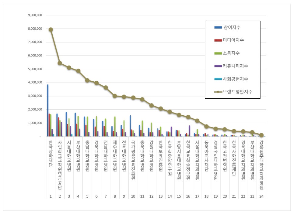 3위, 서울대학교병원 브랜드는 참여지수 1,833,426 미디어지수 936,619 소통지수 1,364,560 커뮤니티지수 778,251 사회공헌지수 200,776이 되면서 브랜드평판지수 5,113,631로 분석됐다. 지난 10월 브랜드평판지수 6,138,463과 비교해보면 16.70% 하락했다.
