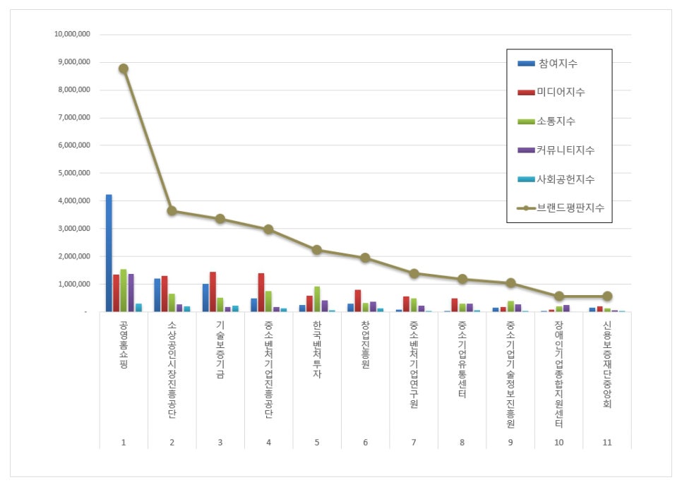 4위, 중소벤처기업진흥공단 브랜드는 참여지수 487,937 미디어지수 1,398,336 소통지수 760,524 커뮤니티지수 185,892 사회공헌지수 141,156이 되면서 브랜드평판지수 2,973,845로 분석됐다. 지난 12월 브랜드평판지수 3,147,478과 비교해보면 5.52% 하락했다.