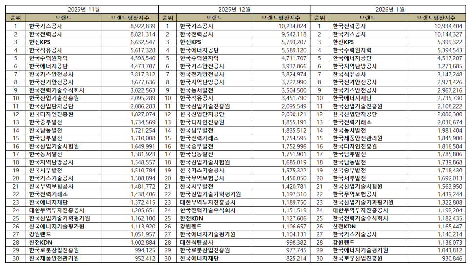 산업통상자원부 공공기관 브랜드평판 2026년 1월 빅데이터 분석결과, 1위 한국전력공사 2위 한국가스공사 3위 한전KPS 순으로 분석되었다.