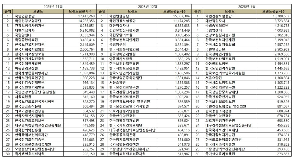 [브랜드평판] 보건복지부 공공기관 브랜드 2026년 1월 빅데이터 분석결과...1위 국민건강보험공단, 2위 대한적십자사, 3위…