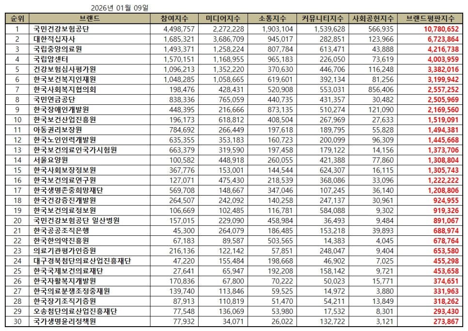 보건복지부 공공기관 브랜드평판 2026년 1월 빅데이터 분석결과, 1위 국민건강보험공단 2위 대한적십자사 3위 국립중앙의료원 순으로 분석되었다.