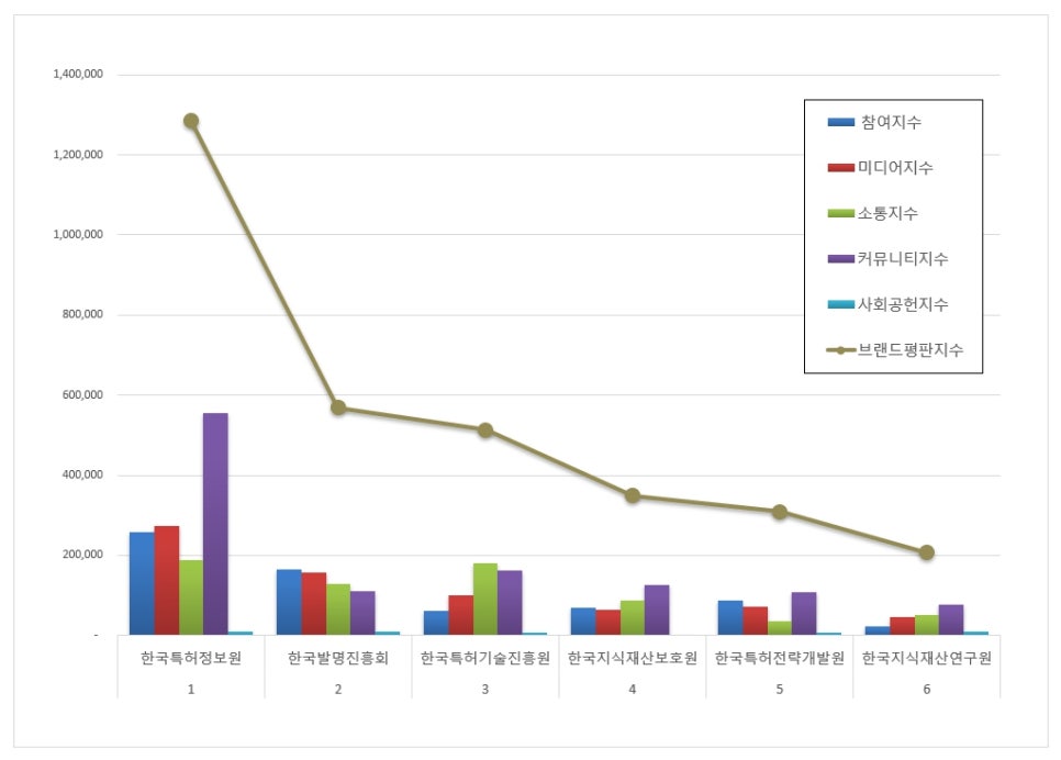1위, 한국특허정보원 브랜드는 참여지수 259,200 미디어지수 274,028 소통지수 187,387 커뮤니티지수 555,261 사회공헌지수 10,269가 되면서 브랜드평판지수 1,286,145로 분석됐다. 지난 9월 브랜드평판지수 1,291,904와 비교해보면 0.45% 하락했다.
