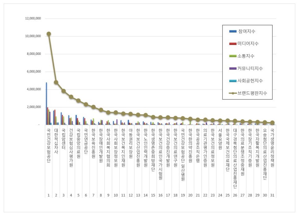 1위, 국민건강보험공단 브랜드는 참여지수 4,798,080 미디어지수 1,984,755 소통지수 1,753,982 커뮤니티지수 1,491,205 사회공헌지수 243,968이 되면서 브랜드평판지수 10,271,990으로 분석됐다. 지난 1월 브랜드평판지수 10,780,652와 비교해보면 4.72% 하락했다.
