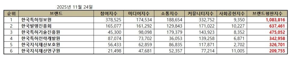 [브랜드평판] 특허청 공공기관 브랜드 2025년 11월 빅데이터 분석결과...1위 한국특허정보원, 2위 한국발명진흥회, 3위 …